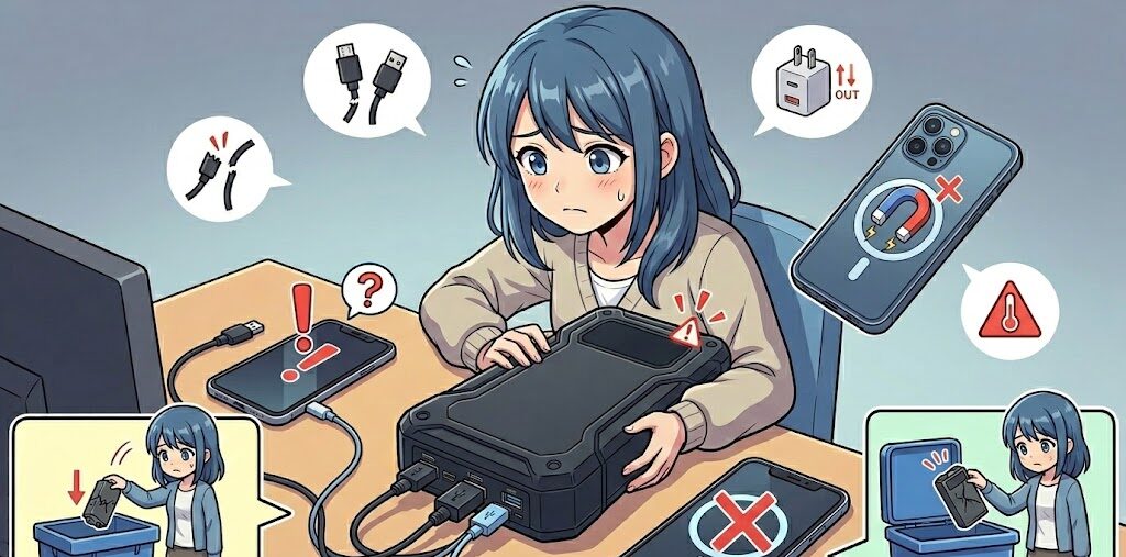 「昨日まで使えていたのに、急に充電できなくなった」というトラブルは、モバイルバッテリーにつきものです。ゲオ モバイルバッテリー 充電 できないという状況に陥ったら、以下のステップを確認してください。