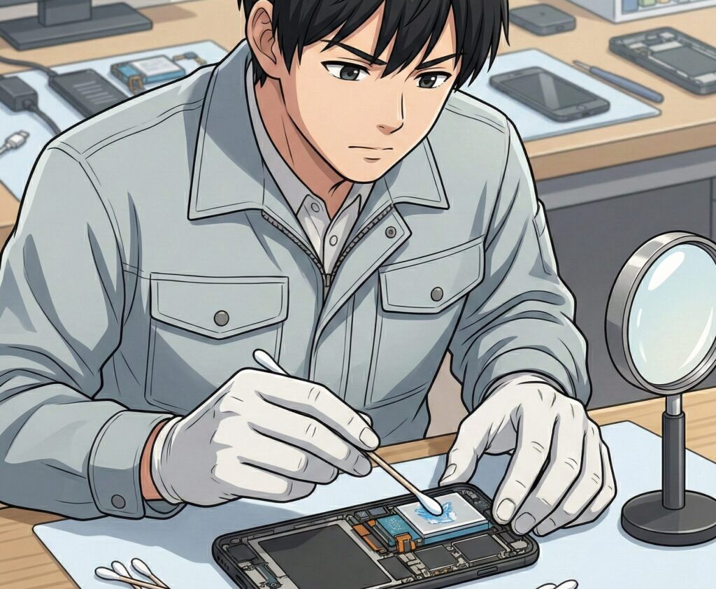 モバイルバッテリー アルコールを使って掃除をする際、最も注意すべきは液体の侵入です。多くのモバイルバッテリーは防水構造になっていません。USBポートやボタンの隙間からアルコールが内部に浸入すると、リチウムイオン電池の制御基盤を腐食させたり、絶縁体を破壊したりする恐れがあります。