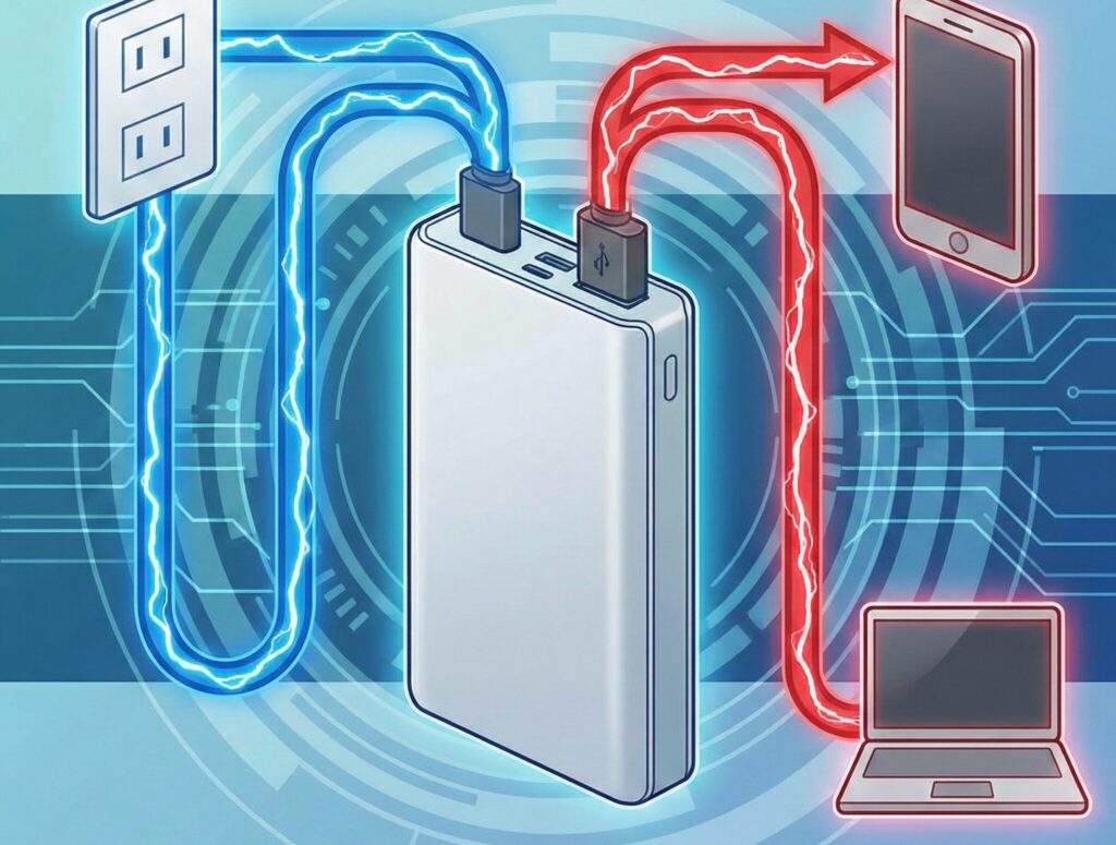 モバイルバッテリーの仕様表を見ると、必ず入力(Input)と出力(Output)という2つの項目が記載されています。この2つのモバイルバッテリー 充電 ワット数の違いを理解することが、快適な充電環境への第一歩です。