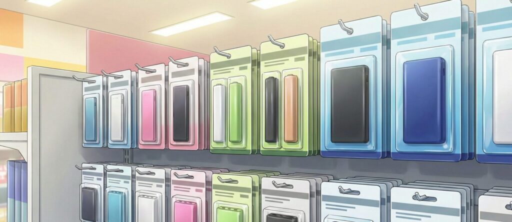 また、店舗の規模(大型店か小型店か)によって在庫状況は大きく異なります。ショッピングモール内に入っている大型のセリアであれば、ガジェット関連の品揃えも豊富ですが、駅前の小型店などでは、スペースの都合上、ケーブル類のみに絞っているケースもあります。店員さんに確認する際は、モバイルバッテリー本体なのか、乾電池式なのかを明確に伝えるとスムーズです。